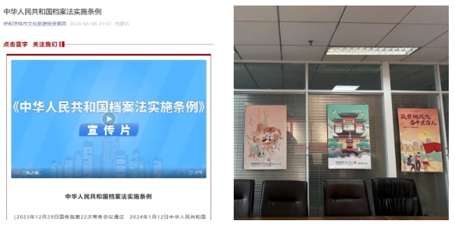 ? ? 市文旅投集團子公司新思路公司利用鴻雁劇場和民族劇場的LED顯示屏對檔案宣傳標(biāo)語和海報進行滾動循環(huán),擴大宣傳效果;會展公司在2024年第十屆呼和浩特國際車展暨新能源產(chǎn)業(yè)博覽會期間,利用展廳電子屏幕滾動播放國際檔案日宣傳標(biāo)語,提升了檔案工作的社會知曉度和影響力;二人臺藝術(shù)研究劇院播放了劇院成立70周年的視頻回顧,通過珍貴的歷史照片和影像資料,展示劇院在現(xiàn)代化進程中的奮斗與貢獻,更是對新時代二人臺人的鞭策和鼓舞首府文旅公司充分發(fā)揮景區(qū)資源優(yōu)勢,利用大青山紅色文化公園、大黑河軍事文化樂園大屏播放《檔案法》《中華人民共和國檔案法實施條例》動漫宣傳片等相關(guān)資料,引導(dǎo)大家樹立法治思維,增強檔案意識。其他子公司也通過發(fā)布微信公眾號、播放宣傳片、組織員工參加網(wǎng)絡(luò)競答、會議傳達等形式普及檔案知識,宣傳檔案文化;同時集團統(tǒng)籌自媒體及各子公司自媒體平臺發(fā)布微信公眾號等各類檔案日宣傳信息,充分發(fā)揮新媒體平臺作用,拓展宣傳渠道,號召廣大員工積極參與到檔案管理工作中去,營造出“人人都是檔案員”的濃厚氛圍。