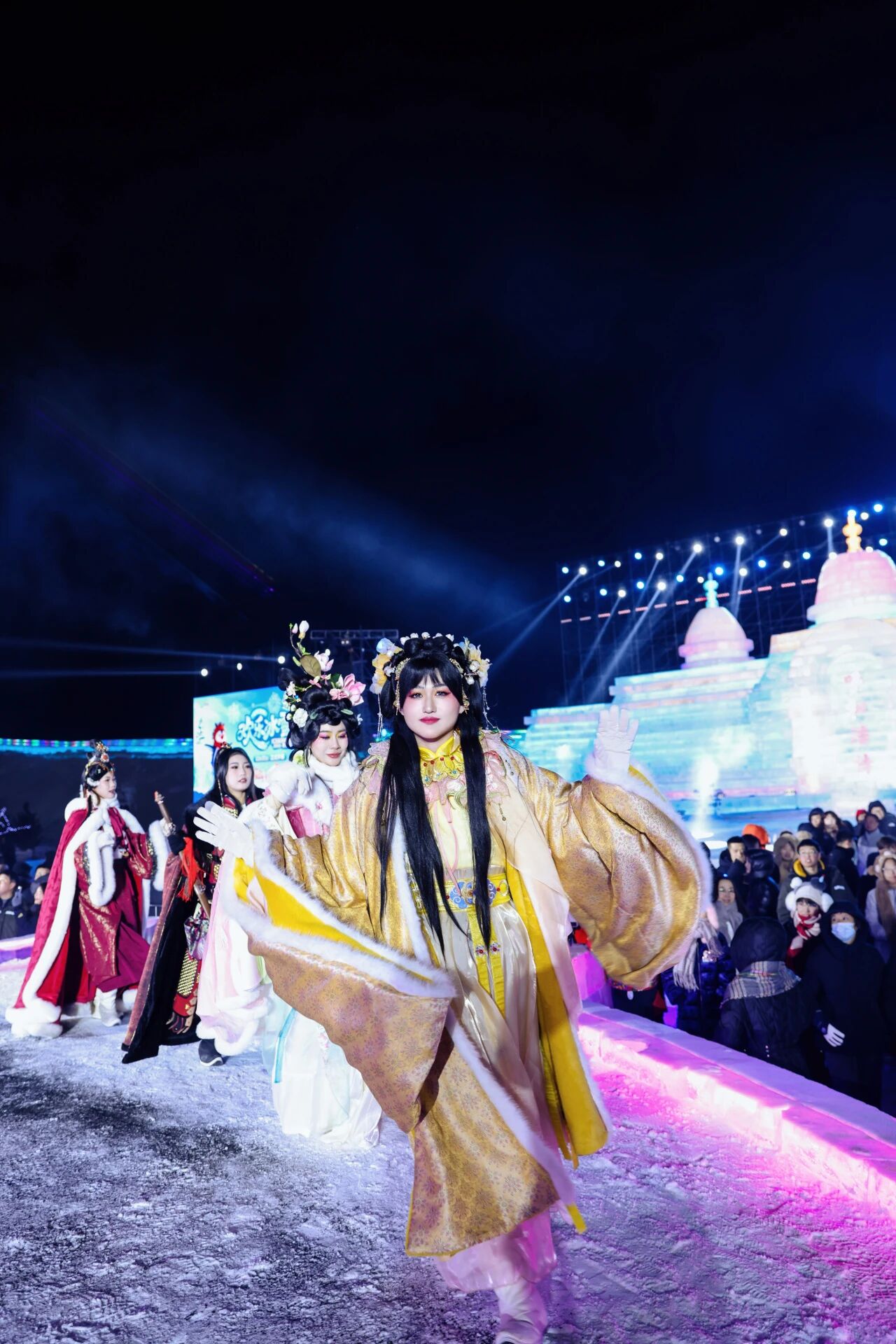 本屆冰雪節(jié)創(chuàng)新實現(xiàn)“一園雙景、晝夜同輝”:日間為晶瑩剔透的冰雪王國,入夜則化身為流光溢彩的燈影幻境。以“花木蘭”“王昭君”為主題、高達12米的非遺自貢主燈組,與“萬馬奔騰”“山海仙闕”“宮燈長卷”等二十余組燈陣共同構(gòu)建出宏大而瑰麗的仙俠敘事空間。