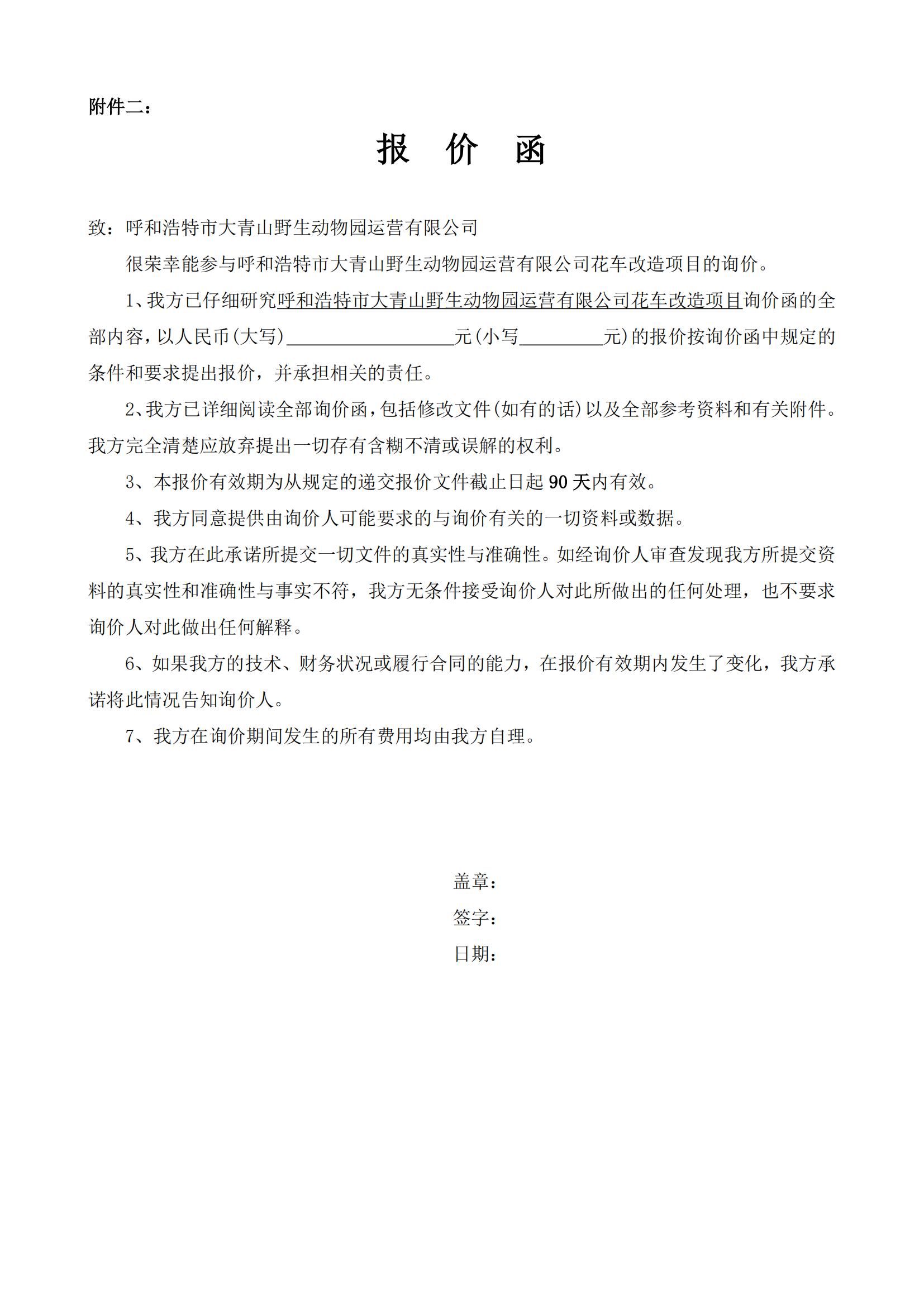 呼和浩特市大青山野生動物園運營有限公司花車改造項目詢價函